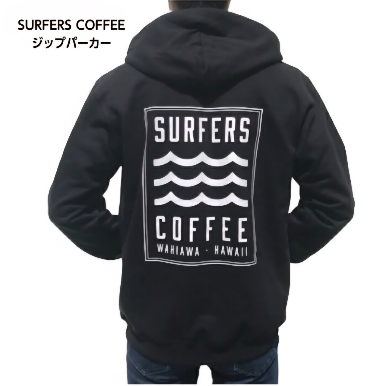 【SURFERS COFFEE バックロゴ ジップパーカー】パーカー SURFERSCOFFEE サーファーズコーヒー バックロゴ BLACK ブラック サーフ サーファー トレーナー フーディー 裏起毛 コーヒー ハワイ ファッション かっこいい メンズ レディース | LOCOLOHA(ロコロハ)