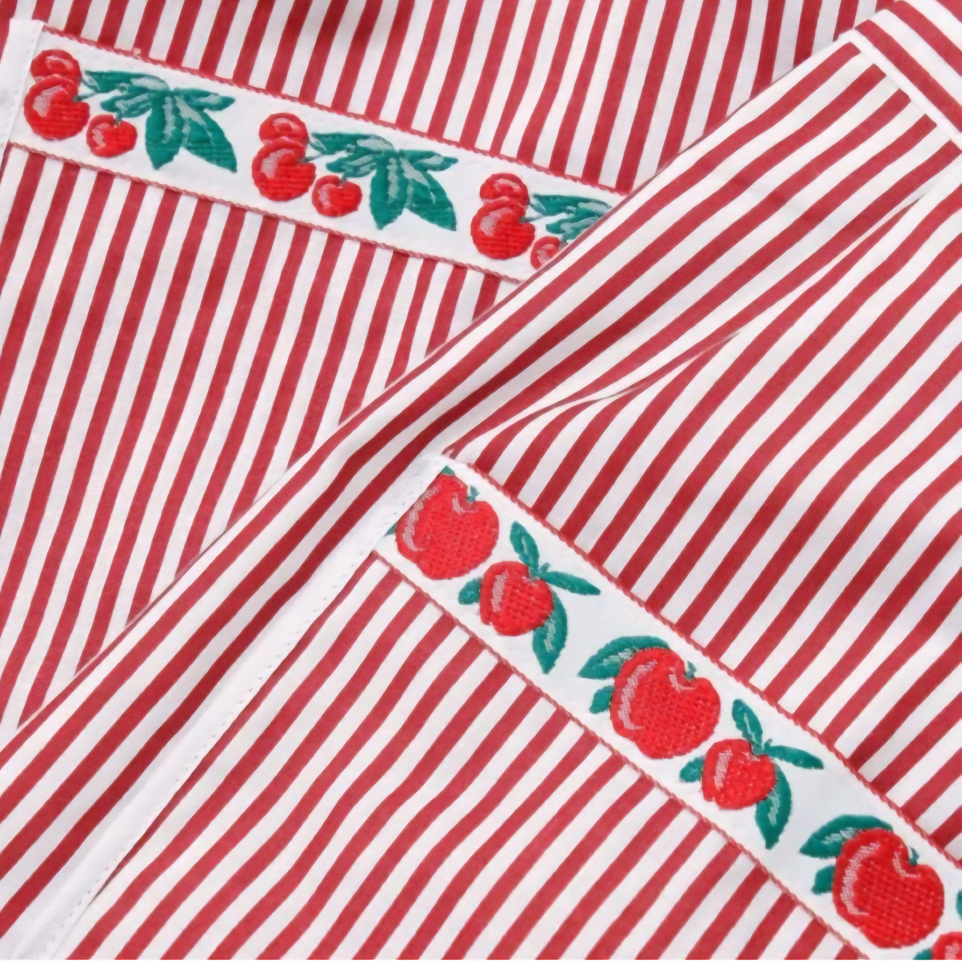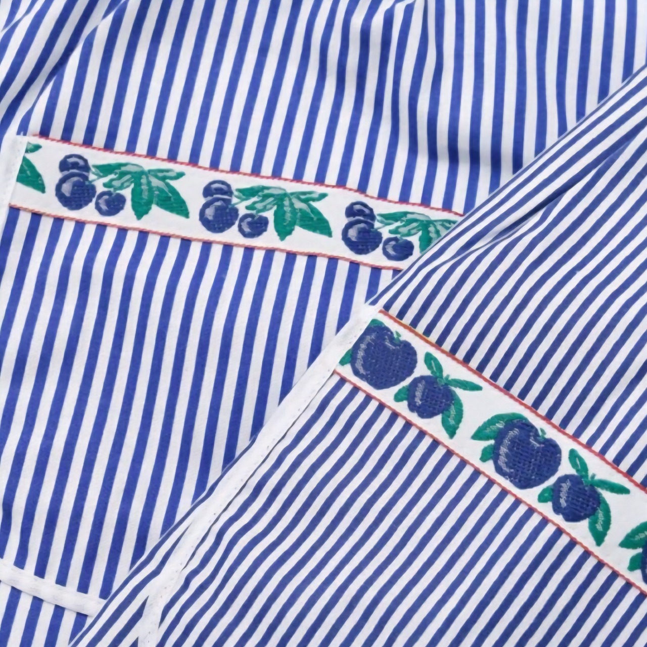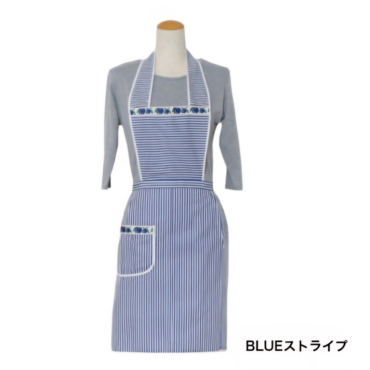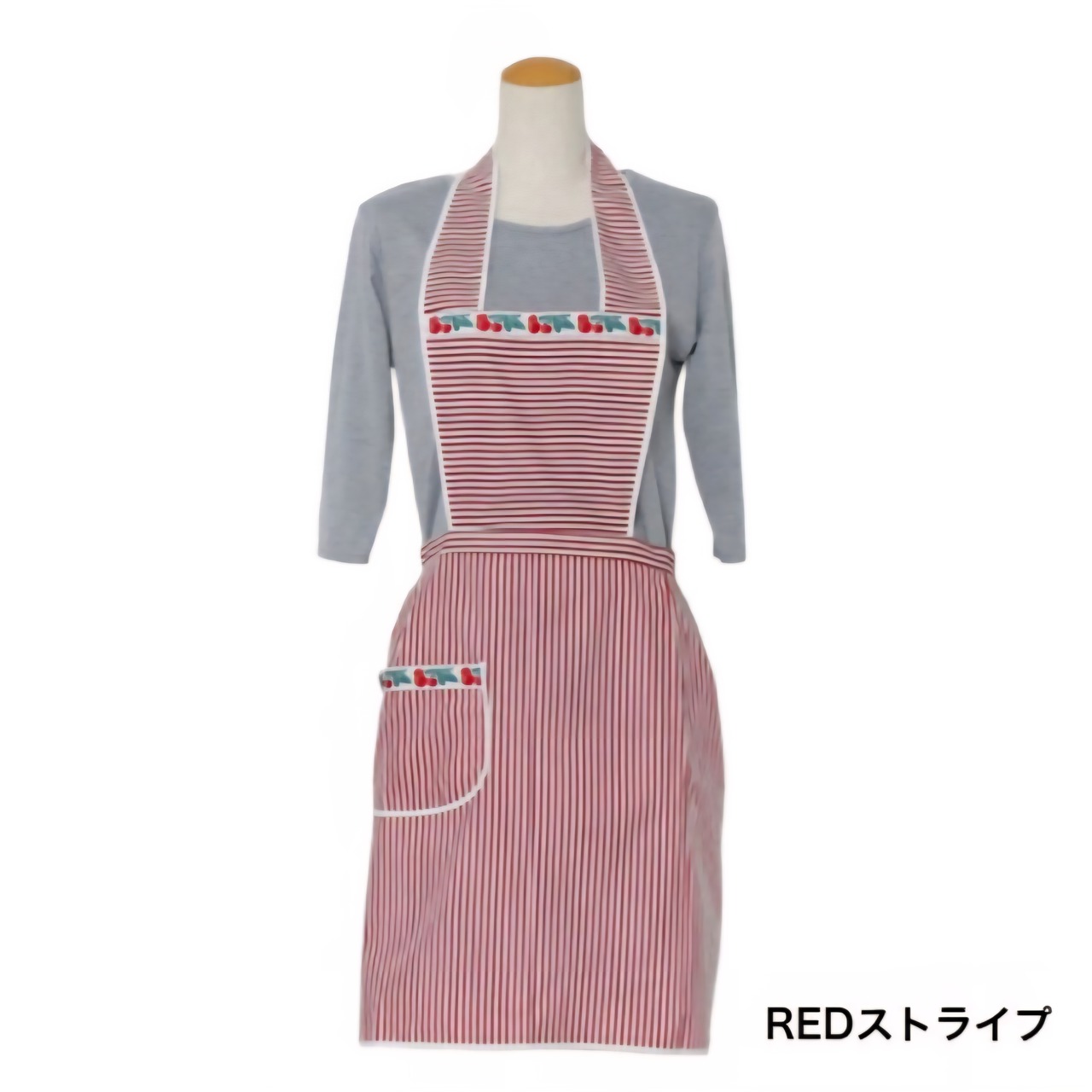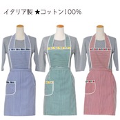 カラフルでヴィンテージ感のあるお花柄のリボンテープとストライプが印象的なエプロン。イタリアのロンバルディア州から直輸入のさらりと気持ちのいい肌触りが魅力のエプロンです。