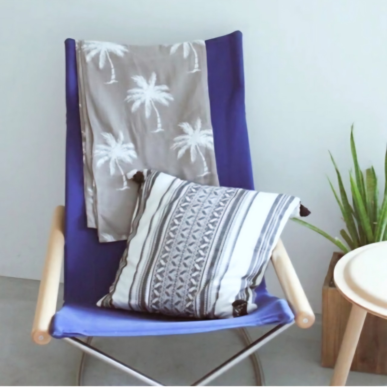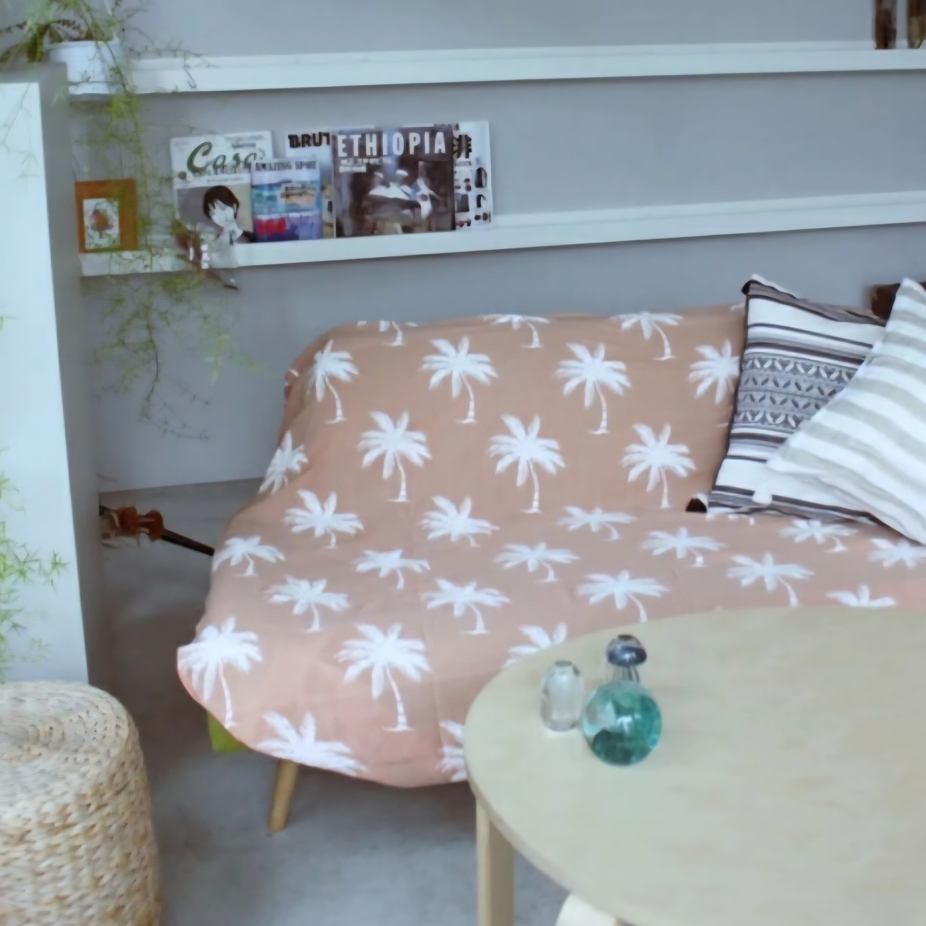ベッドカバー、ソファーカバー、物隠しなど様々なシーンで活躍するフリーカバーにパームツリープリントが施されました。