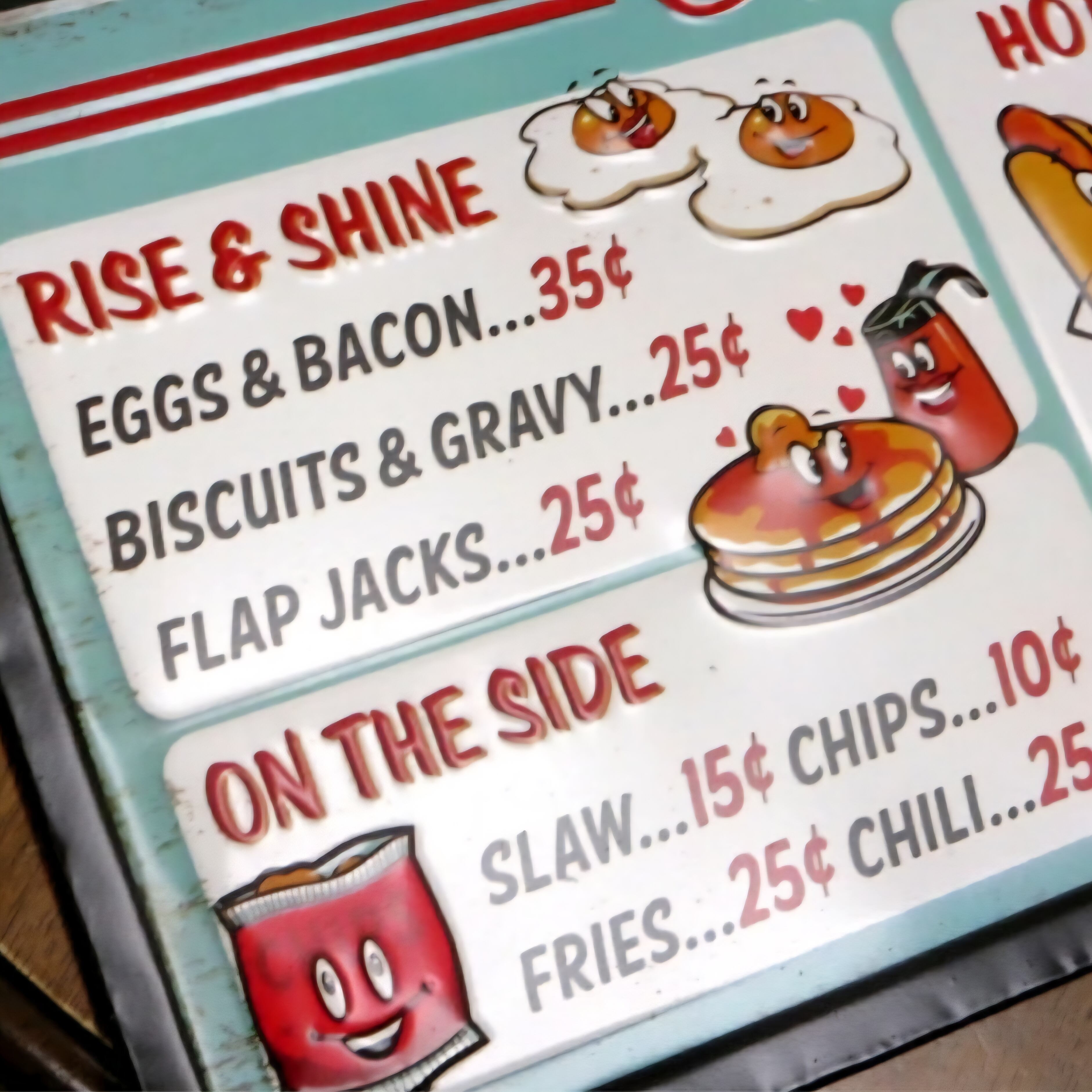 レストランのメニュー表の看板で、アメリカの古びた小さなレストランで本当に置いてあるような雰囲気です!