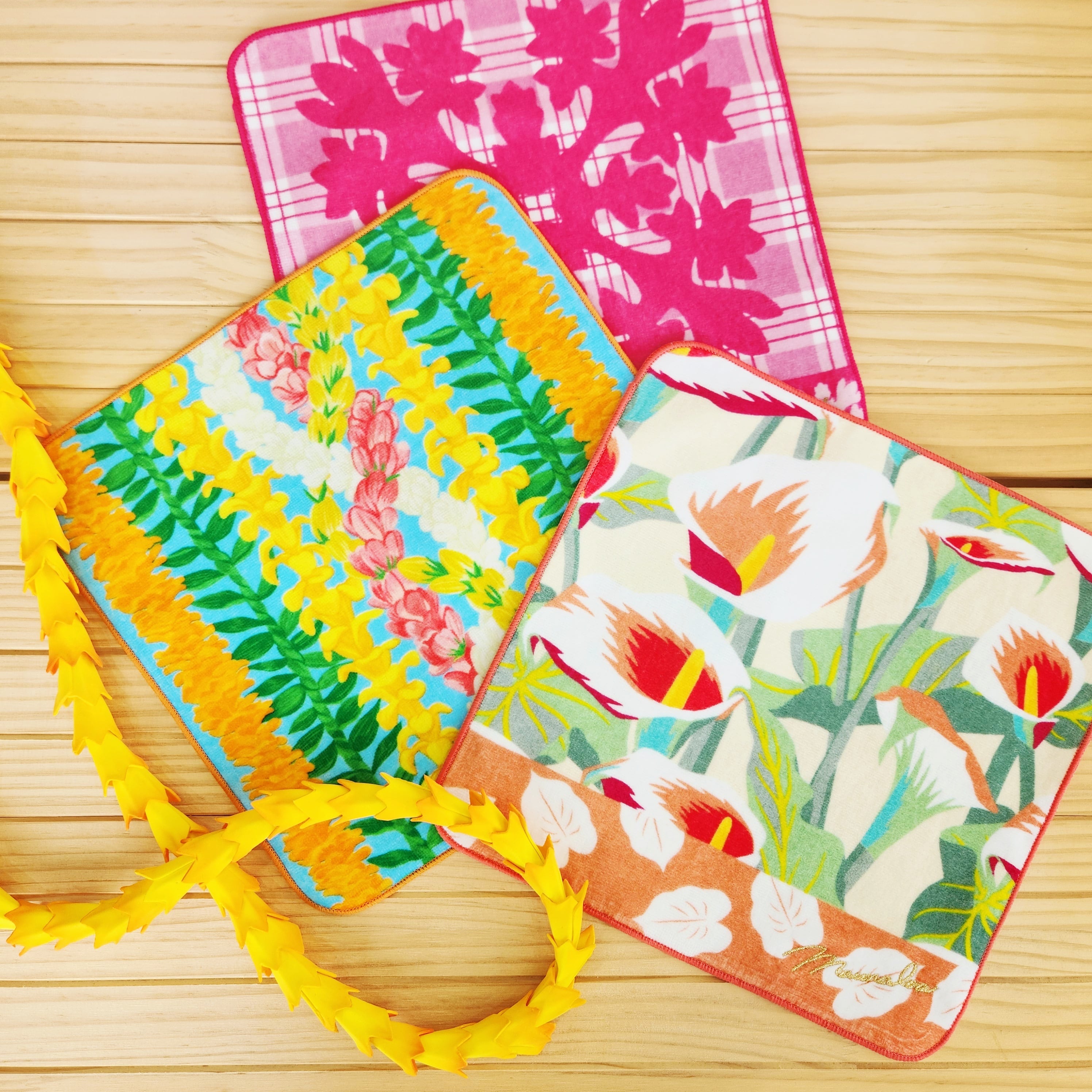 メロー刺繍でふちどられ、カラフルなレイ、カラーの花、パカラチェック&キルトがプリントされたタオルハンカチ。表地は柔らかな肌触り、裏面はパイル地で吸水性の良い一枚。ゴールド刺繍のマウナロアロゴがアクセントになっています。