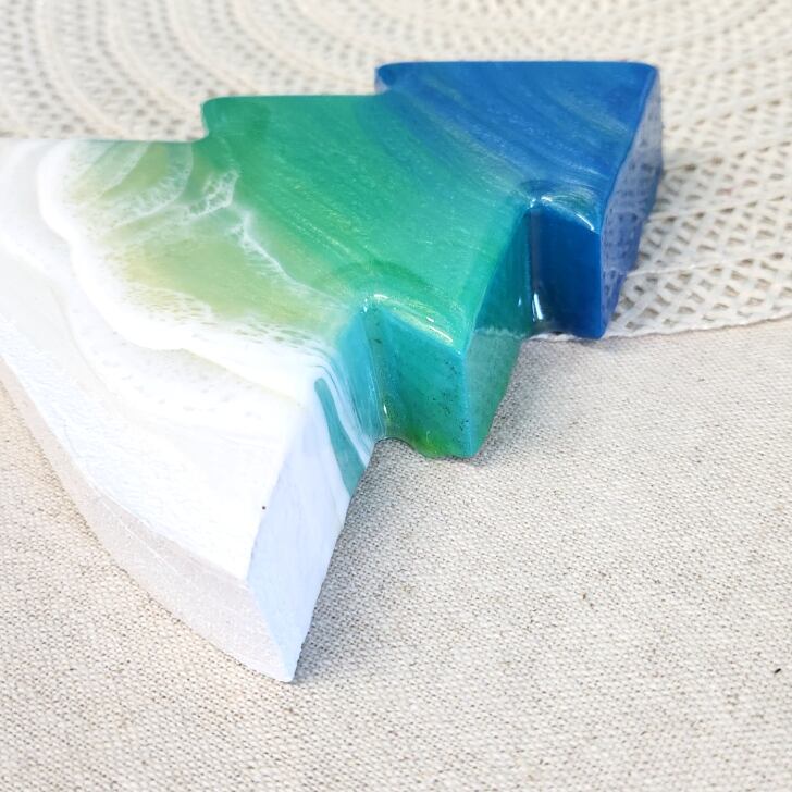 海とクリスマスを欲張ったレジンアート。ツリーに降り積もる雪が波で表現されています。