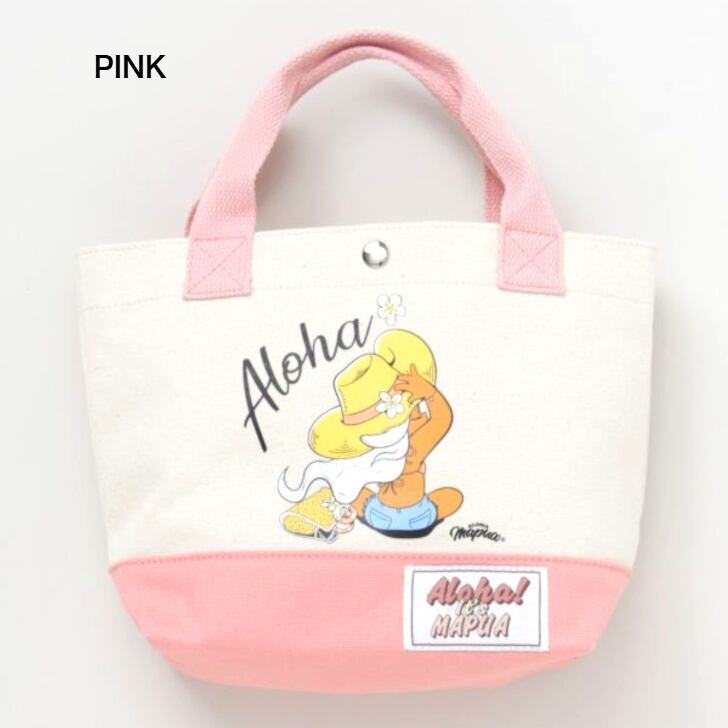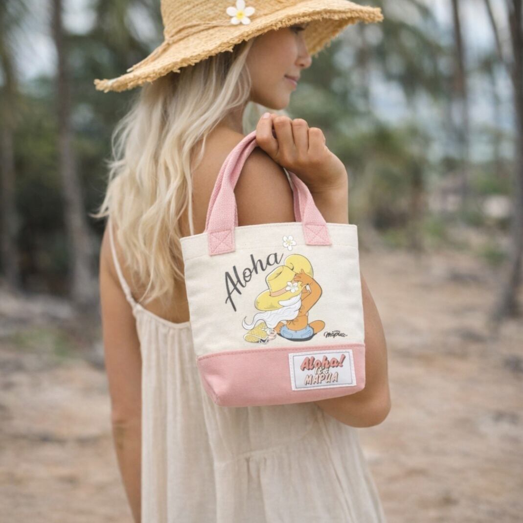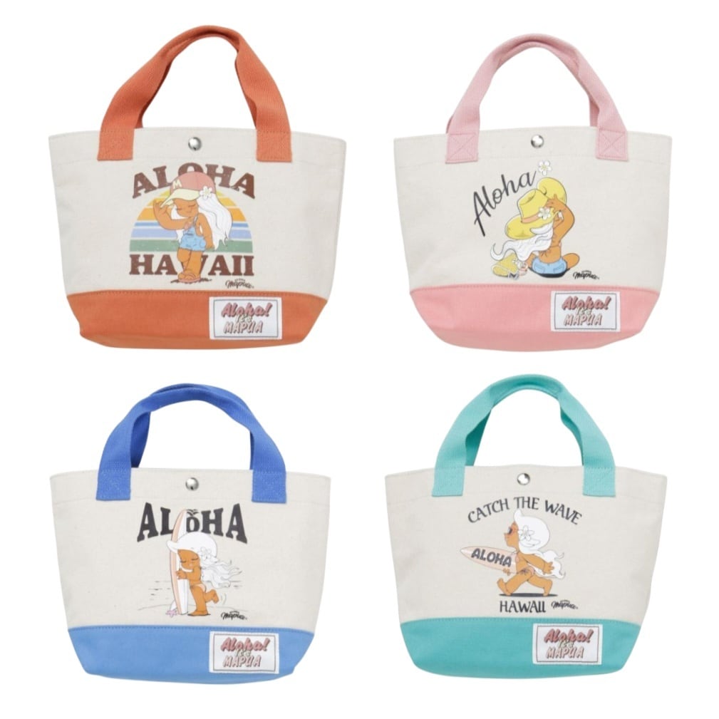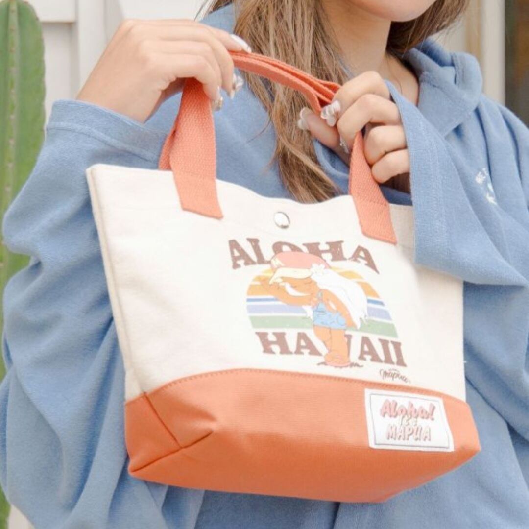 サーフィンとファッションを愛するハワイを感じられるキャラクター、ALOHA MAPUA(アロハマプア)の世界観が詰まったミニトートバッグ。