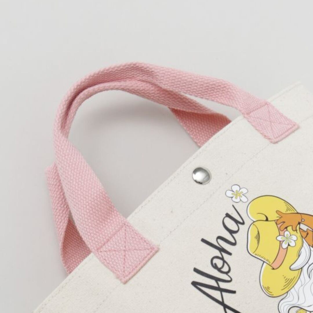 ちょっとしたお出かけやランチバッグに最適なサイズ感。ハワイの陽気な雰囲気を感じるデザインで、持つだけで心も軽やかに。ナチュラルな綿素材が魅力。