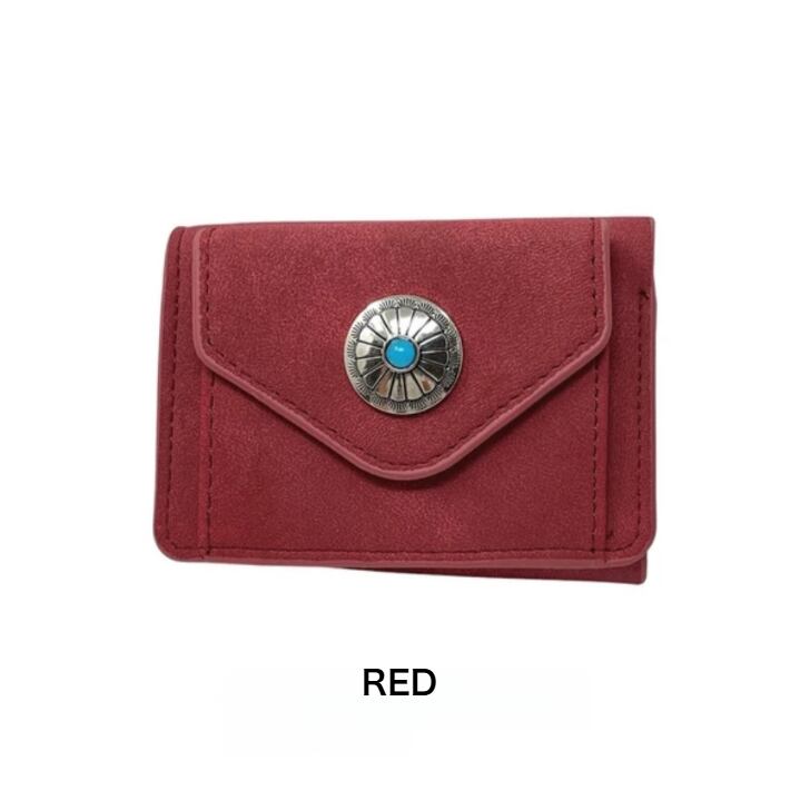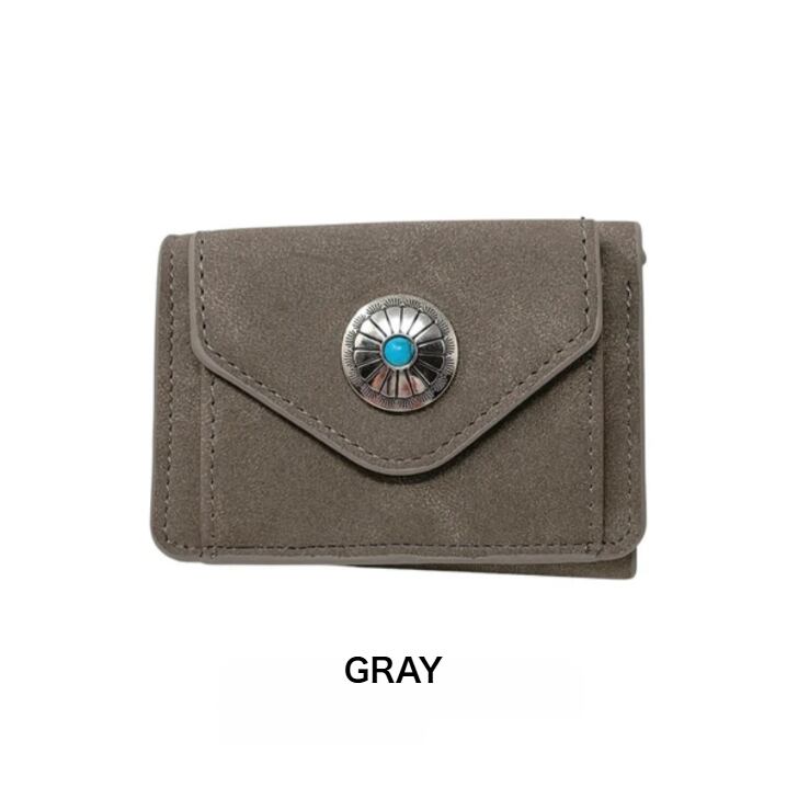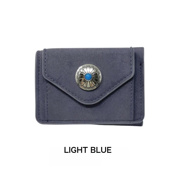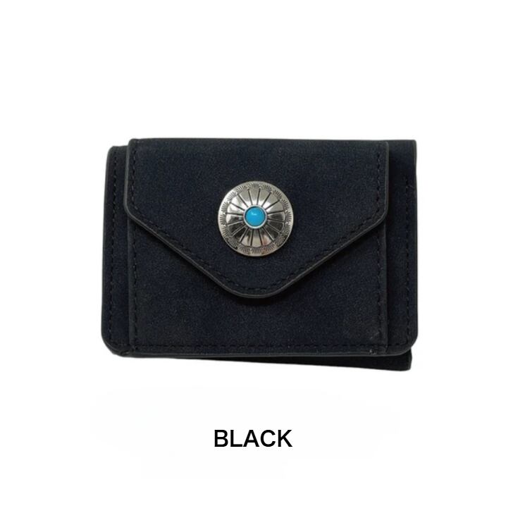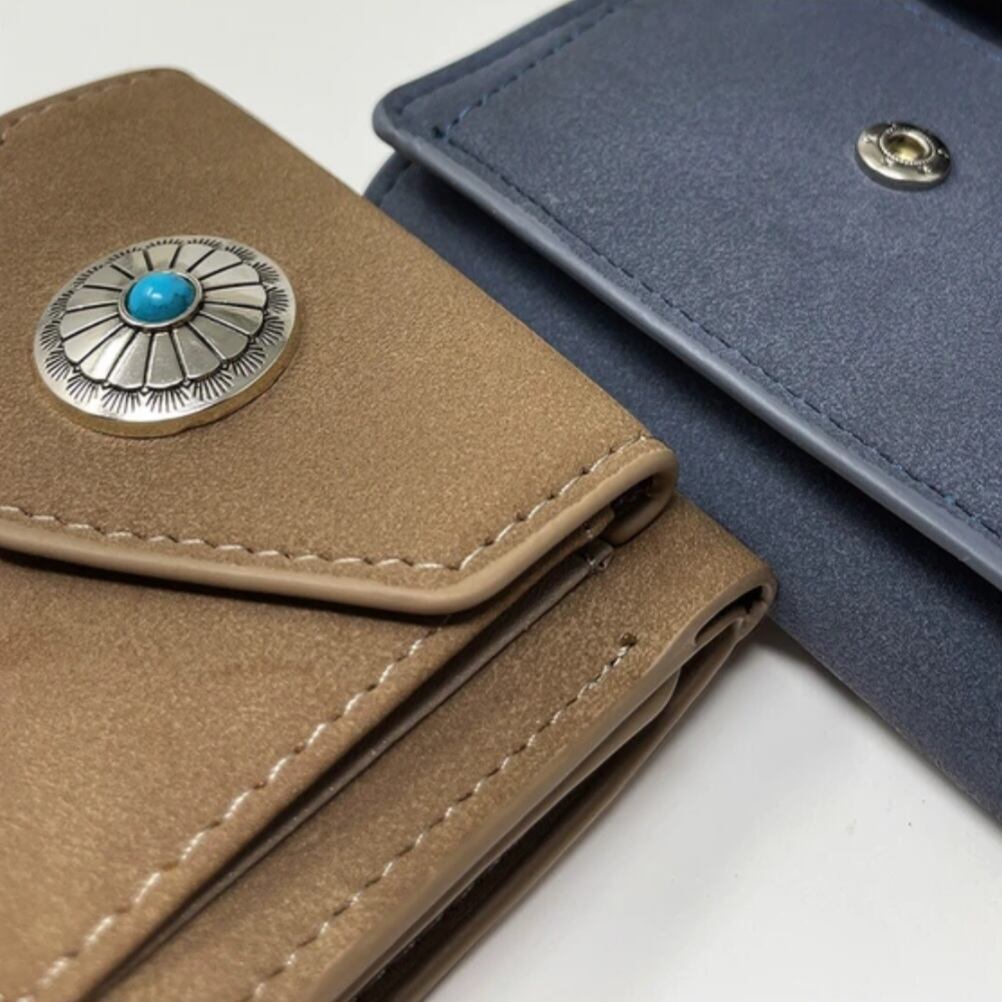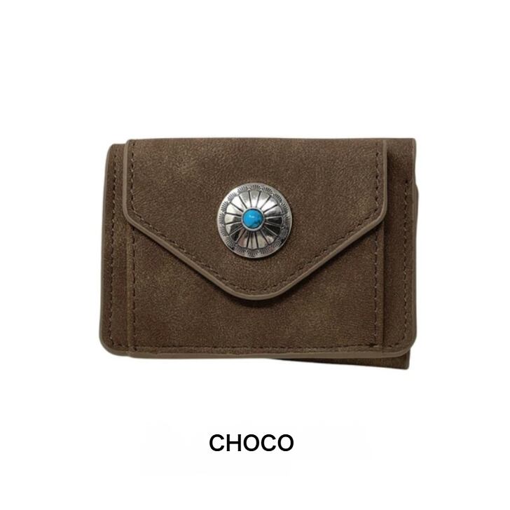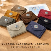 マットな質感で上品な手触りのヌバック調合成皮革をベースにワンポイントにコンチョを配置した三つ折りコンパクトウォレットシリーズ。