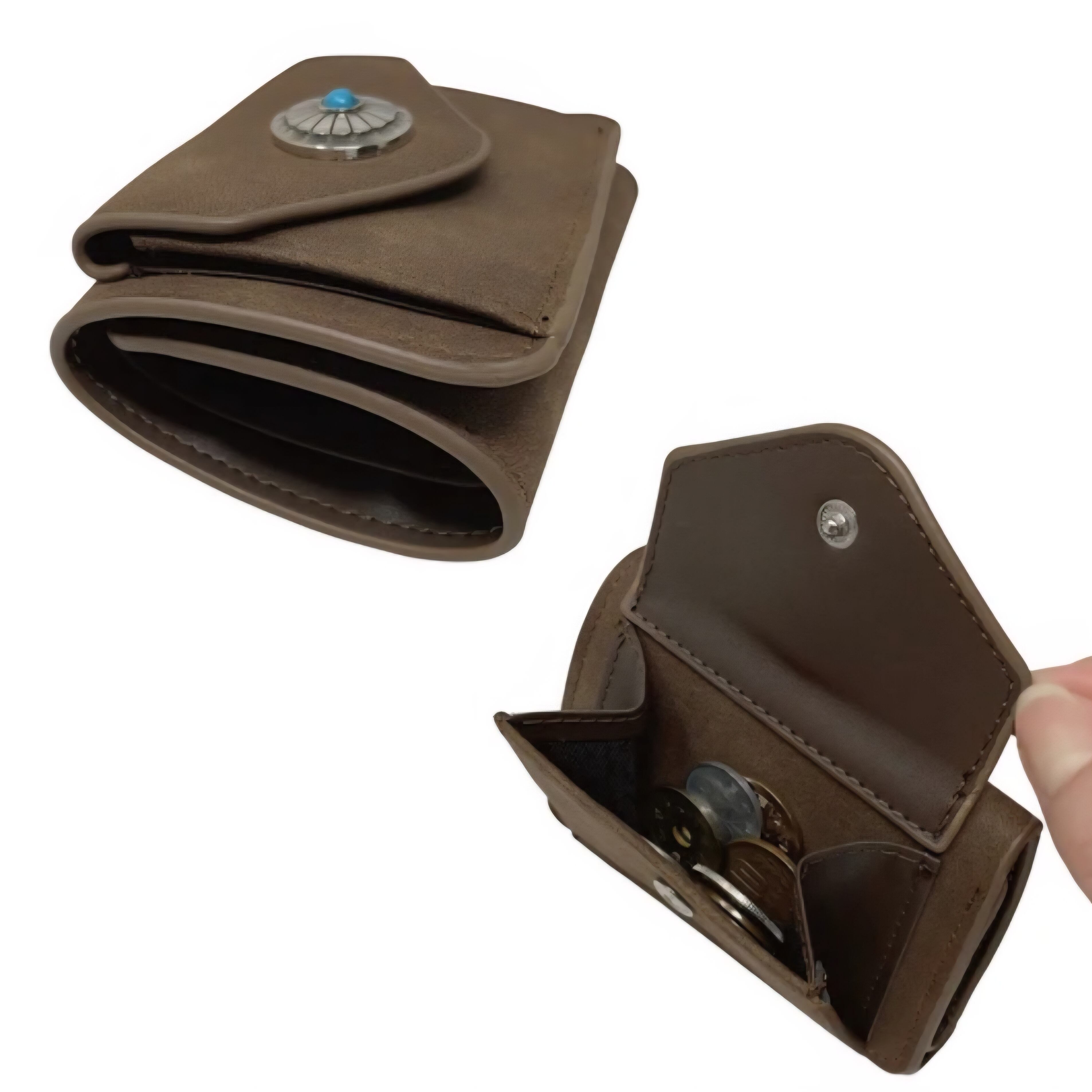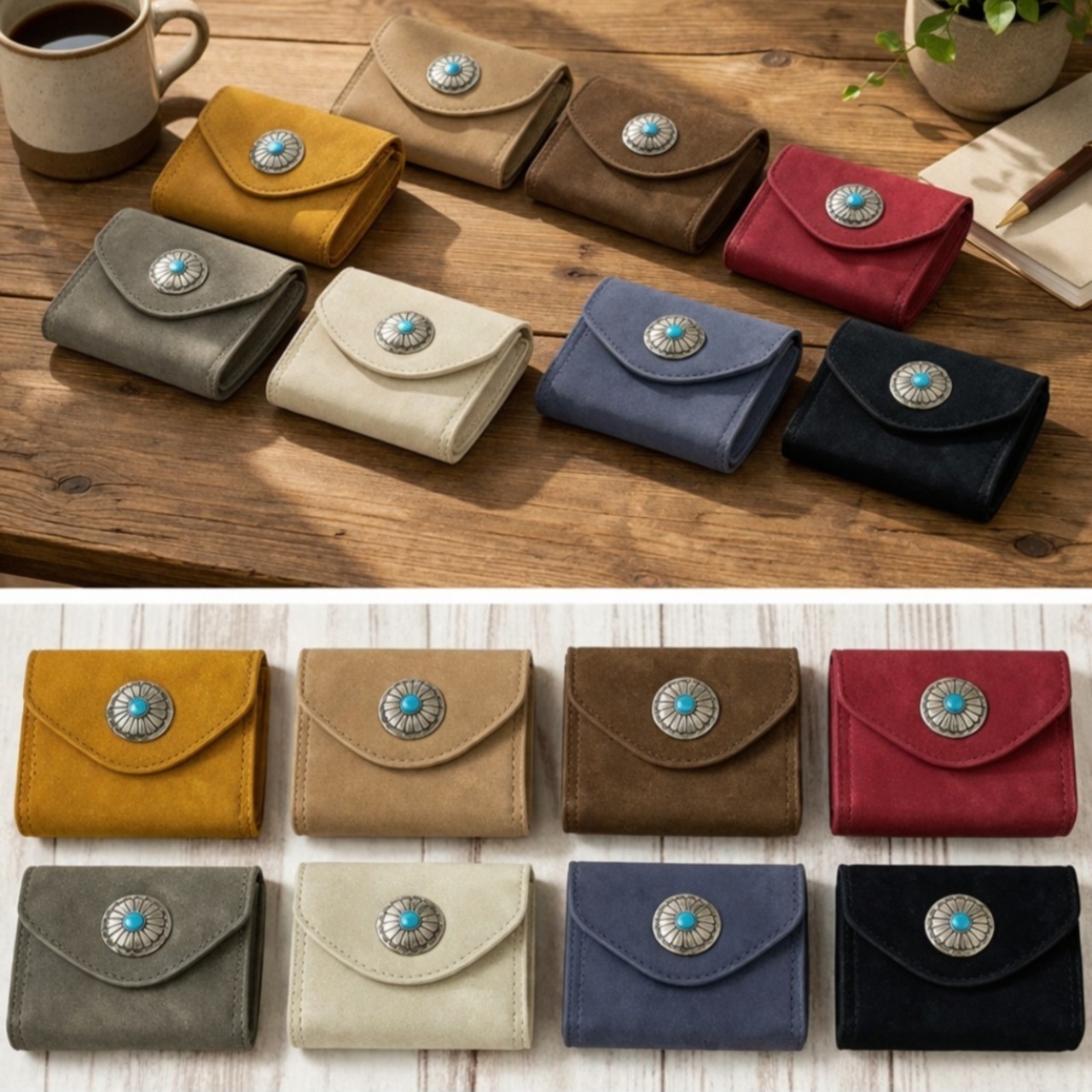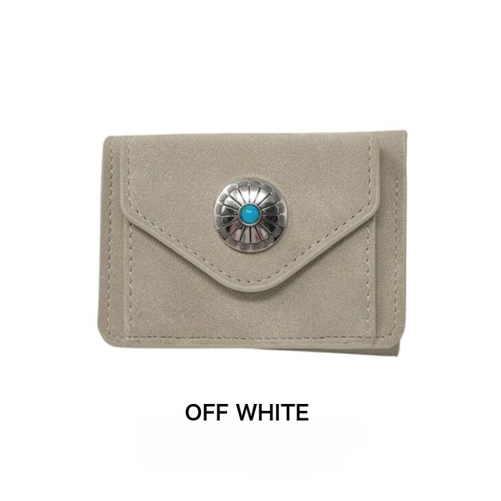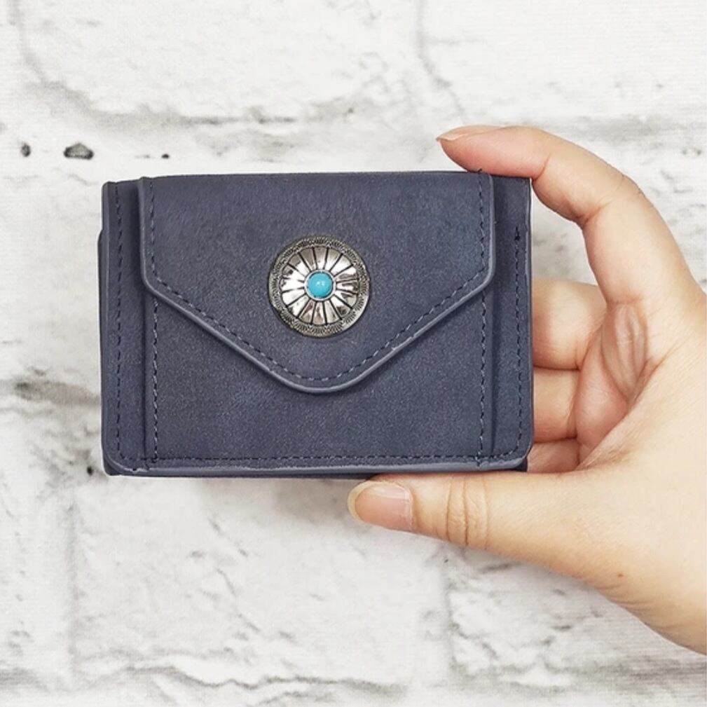 マットな質感で上品な手触りのヌバック調合成皮革をベースにワンポイントにコンチョを配置した三つ折りコンパクトウォレットシリーズ。