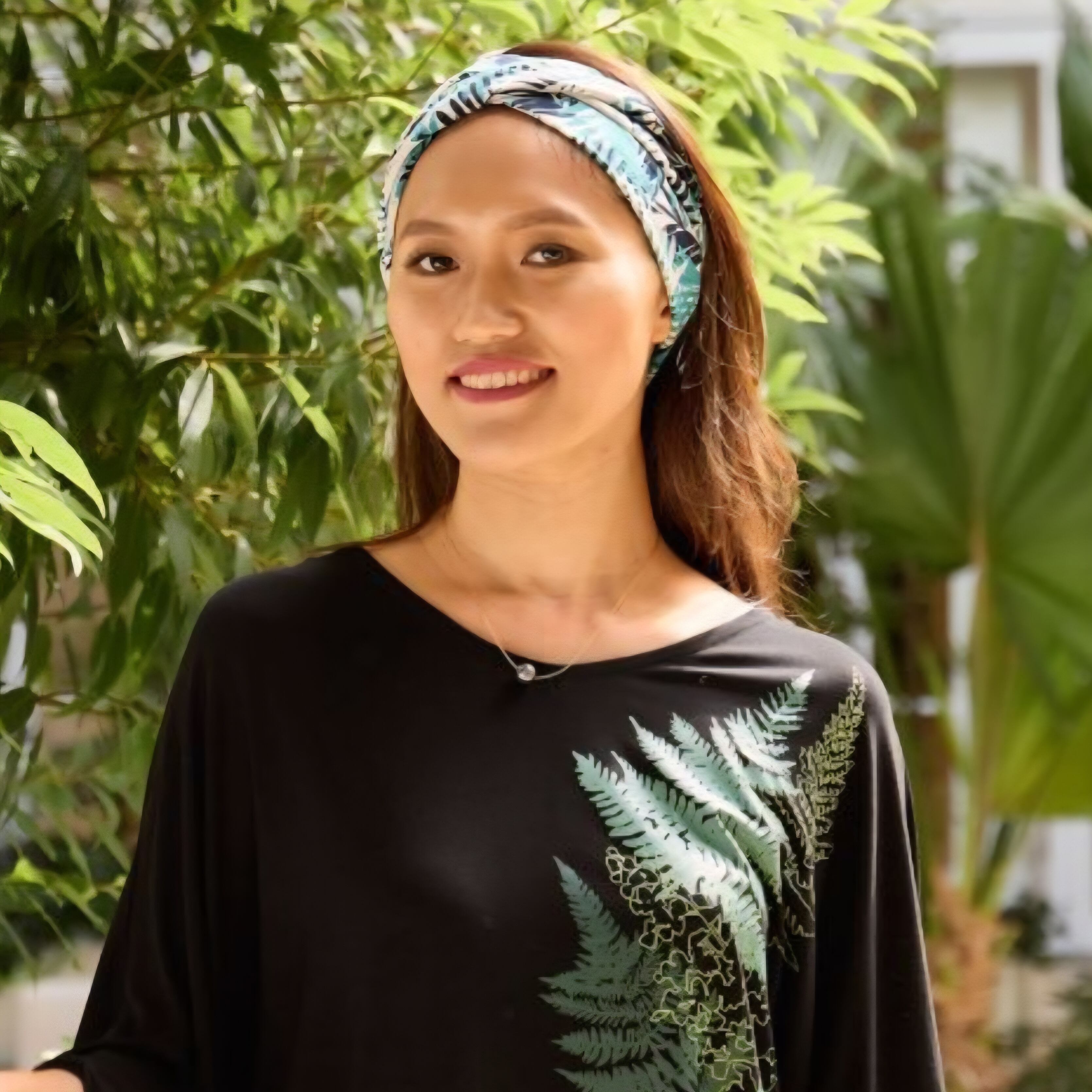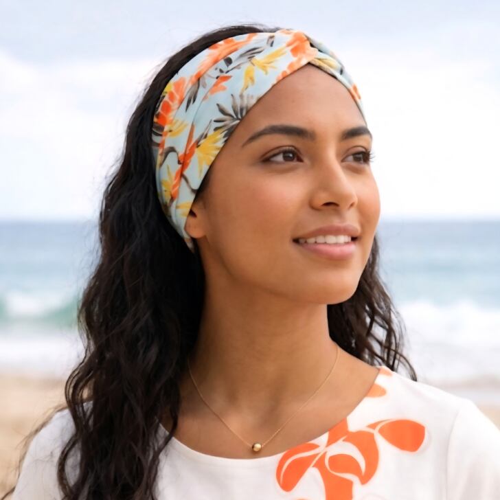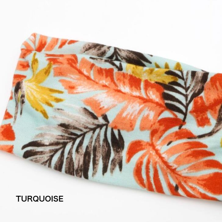 南国の植物柄が華やかなクロスデザインで頭にフィットしやすく、レッスンや日常使いにも大活躍。
