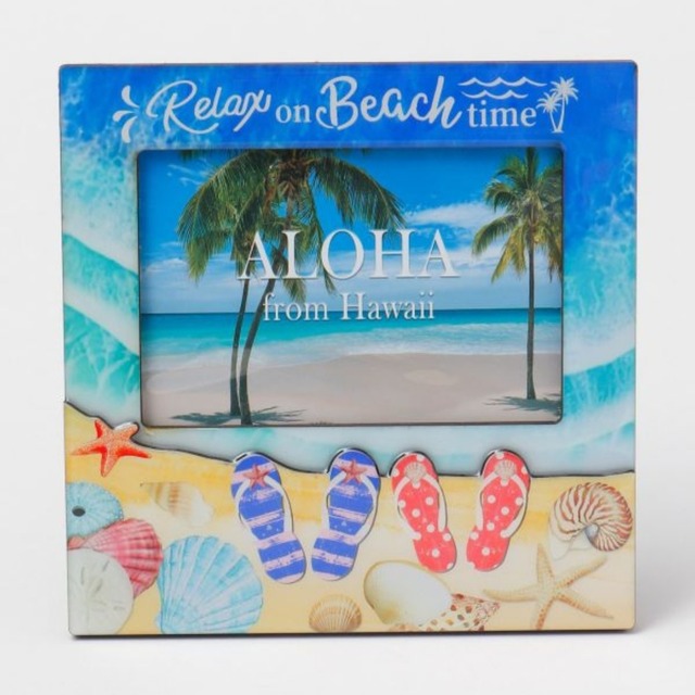 サンダルが並んだ可愛らしいデザインのフォトフレーム。ハワイの海を感じさせてくれます。大切な方と楽しかった思い出を飾るのにピッタリです。 ハワイでの思い出の1枚を飾ってみてはいかがですか? そのまま飾るだけでも素敵なインテリアになります。 サイズ:縦 20cm 横 20cm(写真サイズ 縦11cm 横15.5cm) 素材:MDF アクリル樹脂 (注意) お使いのモニターの設定や環境等により、実際の色味と異なる場合がございます。